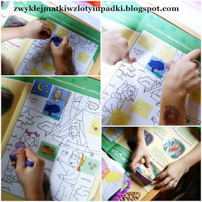 Książeczka jest wykonana w taki sposób, że na jednej stronie mamy ilustracje wzbogacone opisem danego gatunku zwierzęcia, a na drugiej kolorowankę, którą dziecko najpierw uzupełnia naklejkami, a następnie... zwyczajnie koloruje! Jeden minus jaki widzę (ale za to dość poważny), to fakt że dziecko bez pomocy dorosłego nie powycina poszczególnych kwadracików do wklejania. Trzeba najpierw wyciąć wszystkie naklejki, a potem dopiero zabrać się za ich naklejanie, gdyż inaczej dziecko "nie dostanie się" do tej wymarzonej, będącej gdzieś pośrodku arkusza. Jak na dzisiejsze standardy w tego typu wydawnictwach, gdzie wszystkie "stickery" są na arkuszach fabrycznie podocinane... tutaj odczuwa się to zdecydowanie.