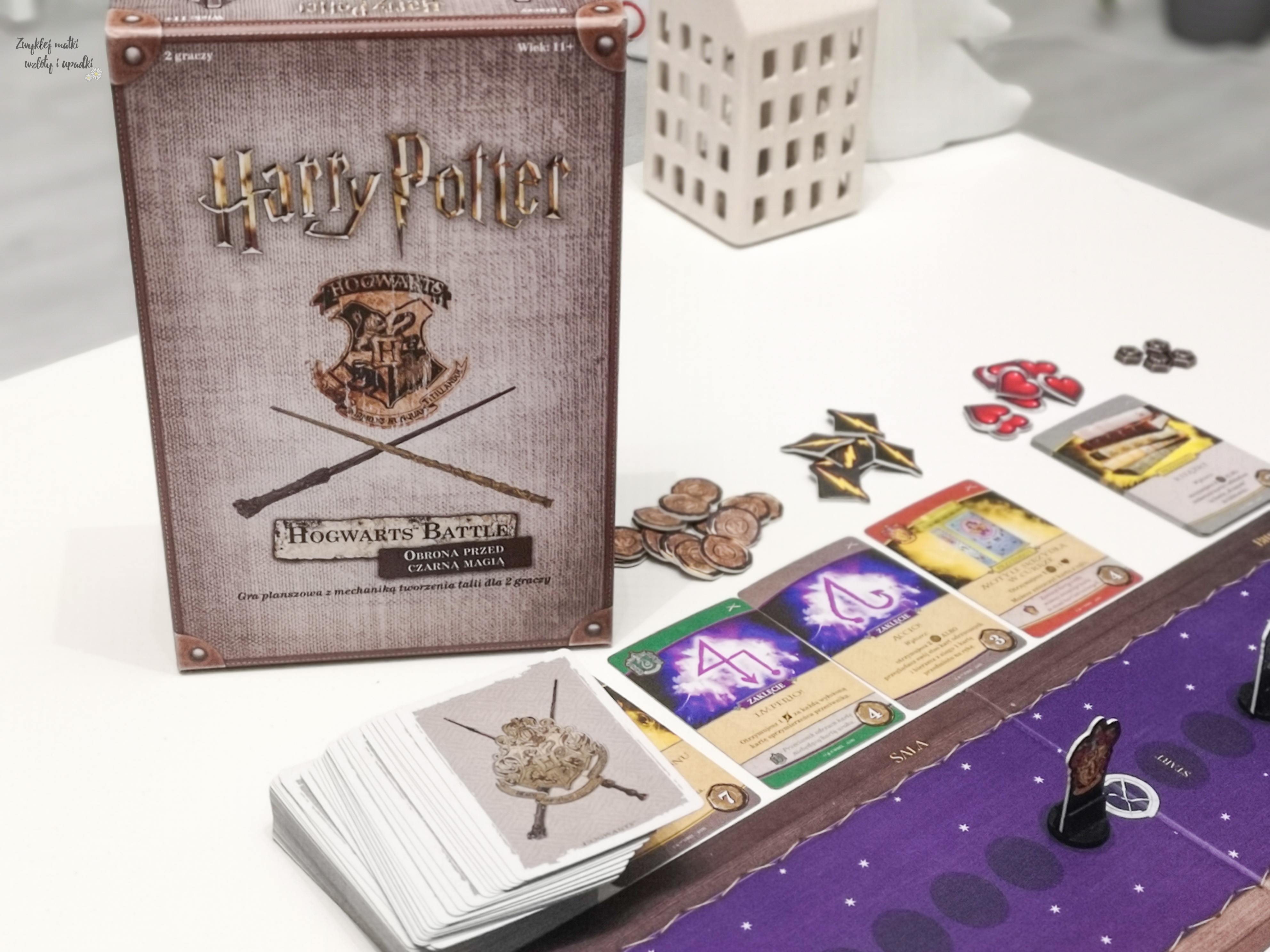Każde zadane obrażenie powoduje, że znacznik przeciwnika przesuwa się o jedno pole w kierunku krawędzi maty. Gdy pionek stanie na skrajnym polu oznaczonym gwiazdką – następuje ogłuszenie. Pokonany zaznacza ten fakt na swojej karcie domu, znaczniki wracają na środek maty, zaś wszystkie zdobyte karty przetasowuje się i losuje z nich kolejny pakiet „na rękę”. Kto pierwszy ogłuszy rywala 3 razy – wygrywa. Prościej się chyba nie da. Losujemy 5 kart, wykonujemy polecenia na nich zawarte, dokupujemy nowe kartoniki i już. Pod tym względem próg wiekowy sugerowany przez wydawcę (+11) jest chyba nieco przesadzony. Poszczególne działania przebiegają bardzo sprawnie, karty co rusz wędrują po stole, a pionki tańcują na macie na przemian w przód i w tył. Jak zatem oceniam grę „Harry Potter – Hogwarts Battle: Obrona przed czarną magią”?